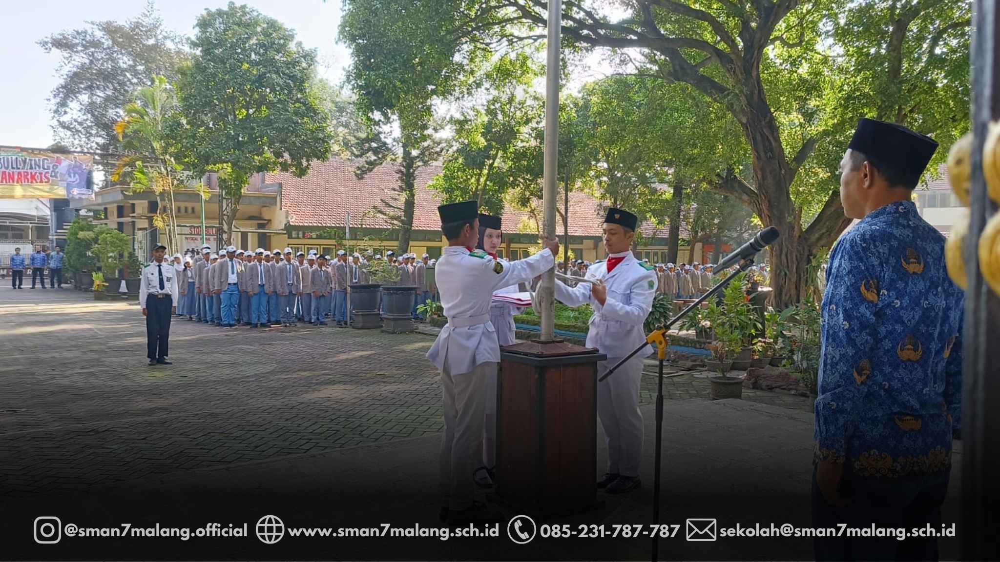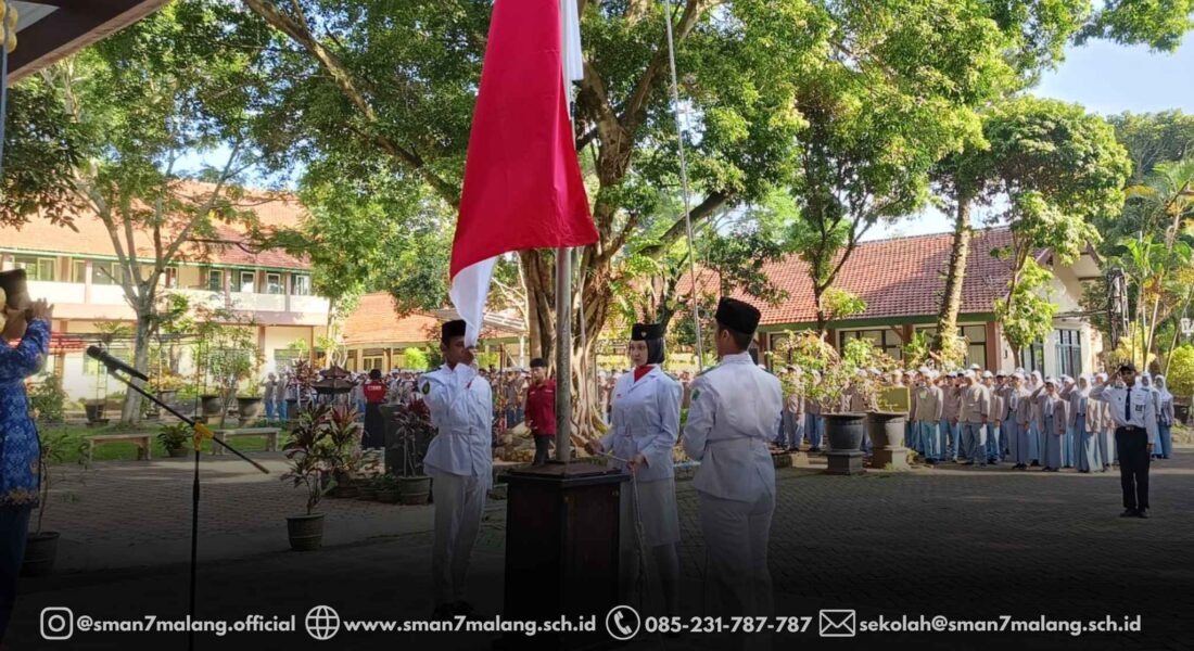 Pengibaran bendera merah putih dilakukan oleh tim paskibraka SMAN 7 Malang yakni Bratansa. Devin Septa dari kelas XII-7 terpilih sebagai pemimpin upacara bendera tersebut. Suasana mendung di pagi hari menambah kekhusukan, terutama saat lantunan lagu dinyanyikan ketika mengheningkan cipta.