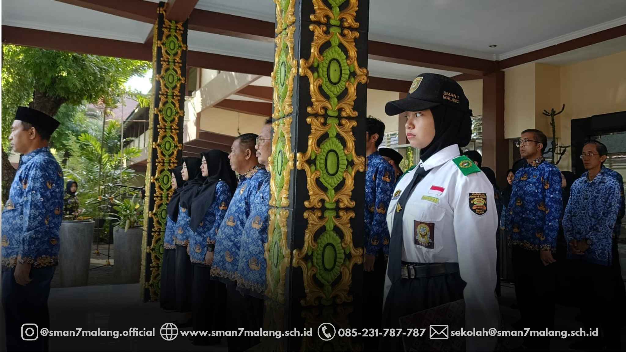 SABHATANSA (12/10) – ”Jatim Tangguh Terus Bertumbuh” merupakan tema yang diangkat dalam perayaan hari jadi jatim yang ke-80. SMAN 7 Kota Malang, sebagai bagian dari Jatim turut serta menyemarakkan kebahagiaan tersebut dengan mengadakan upacara bendera yang diikuti oleh seluruh guru dan tenaga kependidikan serta murid kelas X, XI dan XII. Upacara tersebut dilaksanakan pada Minggu, 12 Oktober 2025 pukul 07.00 WIB dan dipimpin oleh Bapak Mujahidin, S.Pd selaku kepala bagian Tata Usaha.